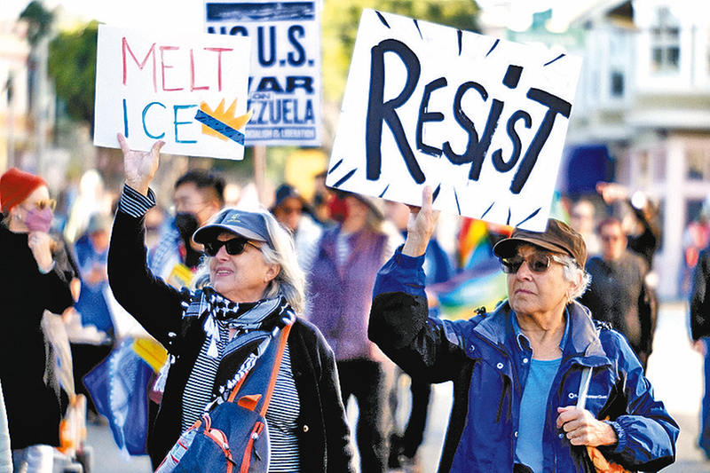 当日,市民在美国加利福尼亚州旧金山参加游行,抗议美国对委内瑞拉的军事行动,并反对美国联邦执法人员在明尼苏达州的暴力执法行为。