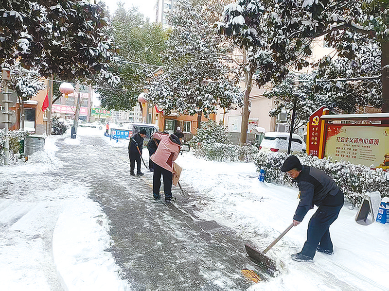 1月20日的驻马店市区寒意袭人。一场降雪过后,市区中华大道西段万家花园小区的路面被积雪覆盖,给居民出行带来极大隐患。驻马店市泰春物业管理有限公司总经理王丽军带领全体物业人员,为小区清扫积雪、撒融雪剂,保障小区居民出行安全。