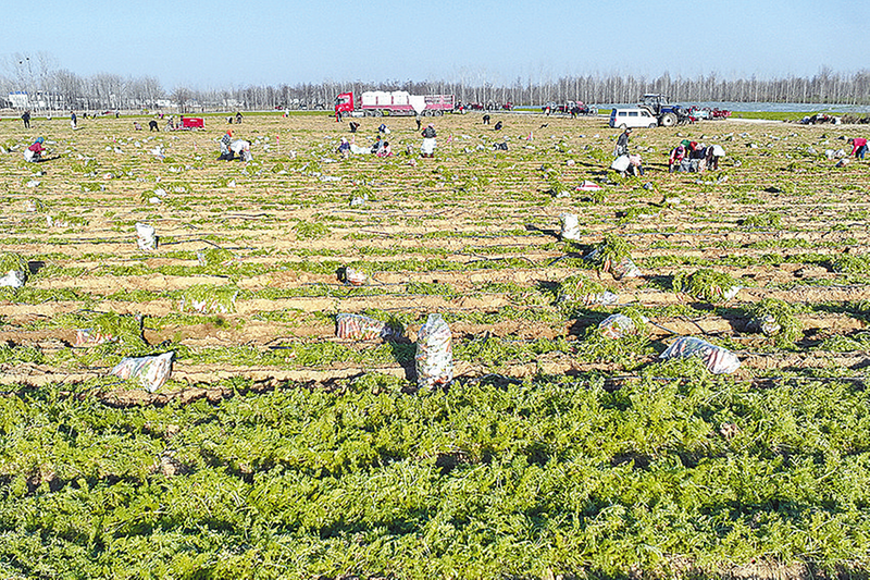 连日来,正阳县大林镇十门村的320亩胡萝卜基地迎来采收旺季。1月15日,田间地头一派繁忙景象(如图),工人采收、削缨、装袋,一个个色泽红润的胡萝卜已被订单锁定,即将发往全国市场。据了解,这片土地在胡萝卜采收完毕后将立即转向土豆种植,通过“胡萝卜——土豆”轮作模式,实现“一地双收”,提升土地效益。