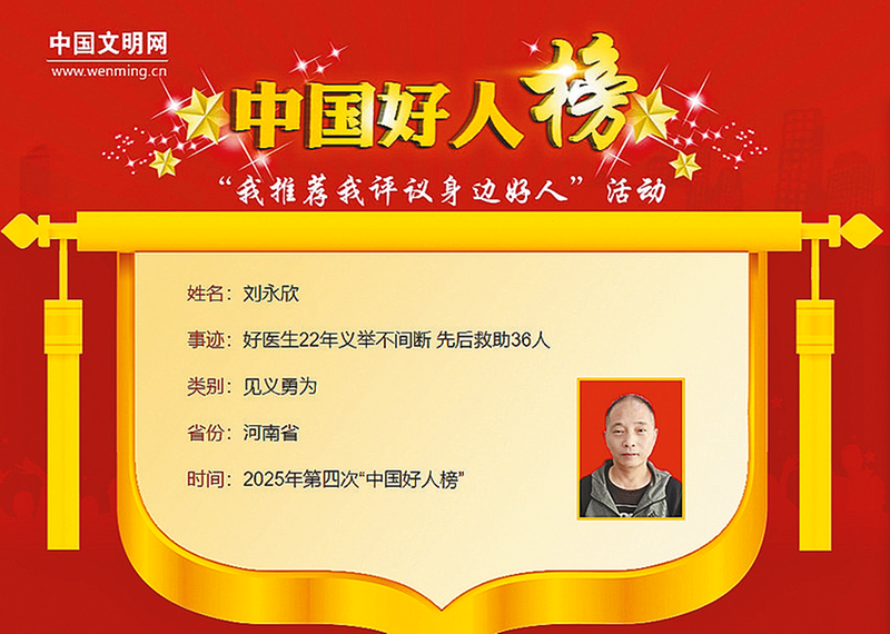 网络截图 本报讯(全媒体记者 刘金霞)1月23日,2025年第四批“中国好人榜”在四川宜宾发布,全国139名身边好人光荣上榜。驻马店市确山县永欣医院主治医师刘永欣凭借22年不间断的见义勇为善举,入选“见义勇为”类好人名单,成为河南此次上榜的5人之一。