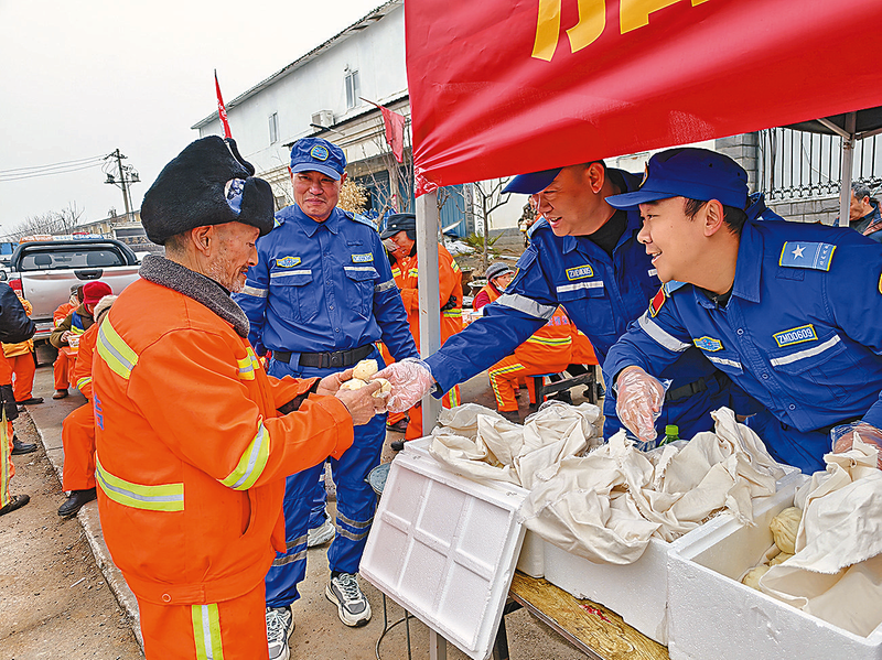 活动现场,一面印着“腊八暖冬福满人间”的红色横幅格外醒目。数十名身着橙色工装的环卫工人围站在帐篷前,从搜救队队员手中接过一碗碗温热的八宝粥和冒着热气的包子。粥香混着暖意驱散了冬日的寒冷,大家脸上都洋溢着满足的笑容。