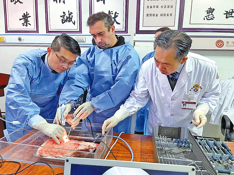 吴鹏(右一)和脊柱科医师指导巴西专家进行实操训练。 本报讯(文/图 全媒体记者 王捷通讯员 王静)近日,来自巴西的微创脊柱外科专家团来到驻马店正骨医院,开启为期3天的单侧双通道脊柱内镜(UBE)技术专项学习交流。
