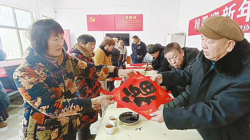 1月28日上午,由驻马店市政协文化和文史委员会主办的“送文化下乡”活动走进驿城区蚁蜂镇老庄村。驻马店市天中书画艺术研究会天中书画院的十余位书画艺术家齐聚一堂,为村民义写春联、赠送“福”字。