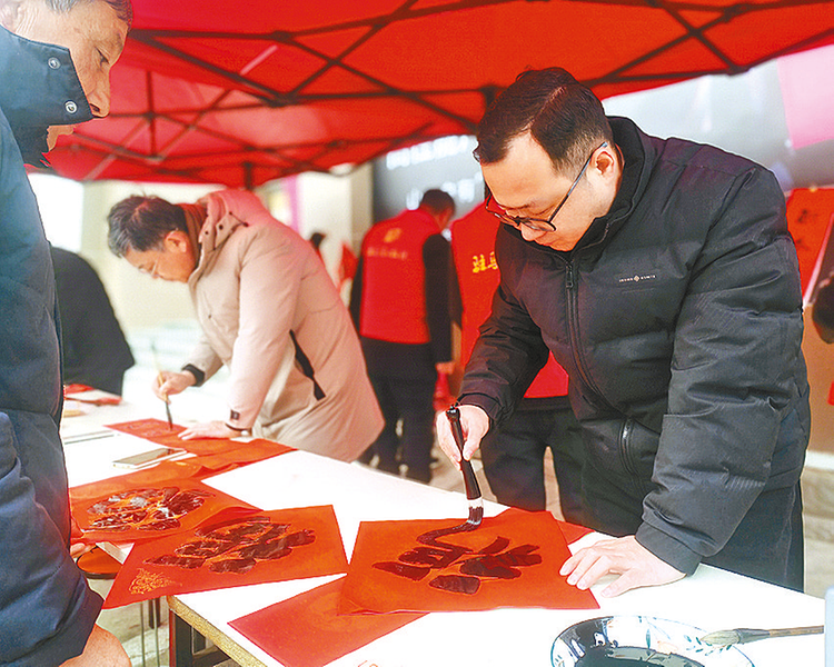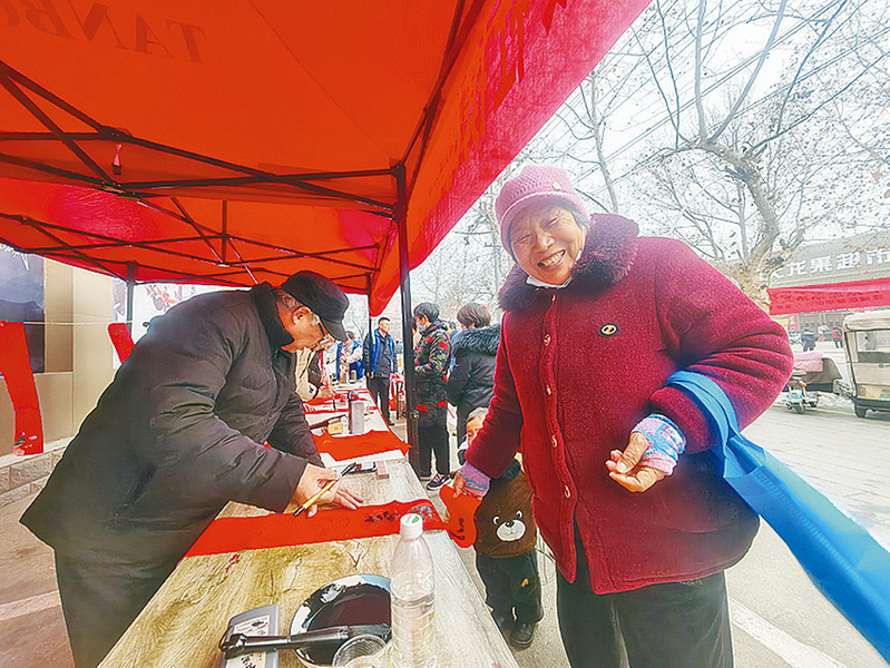 现场热闹非凡却井然有序,市民自觉排队等候,拿到墨迹未干的春联后,小心翼翼地展开晾晒,脸上洋溢着幸福的笑容。