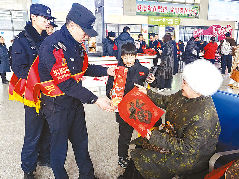 武汉铁路公安处驻马店西站派出所民警在候车厅将书法家手写的“福”字送到旅客手中。