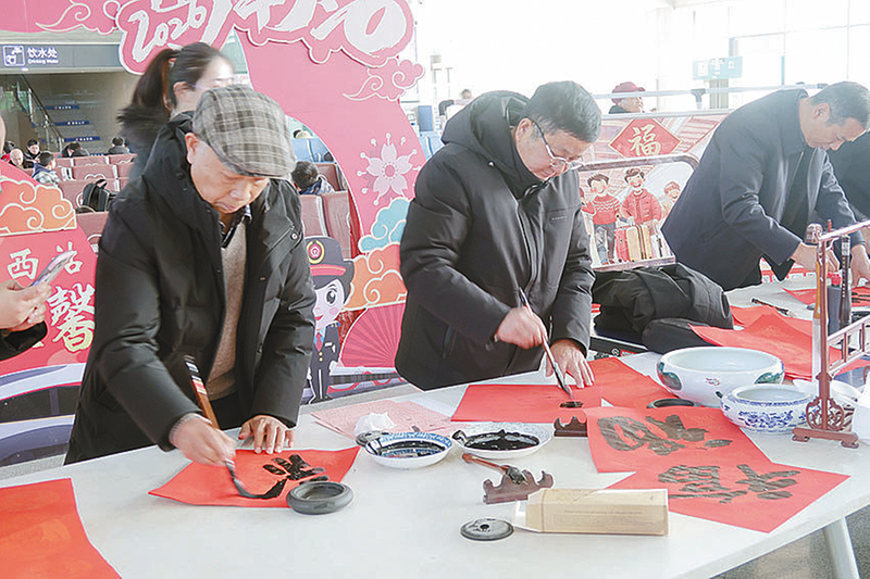在驻马店西站,书法家为旅客们现场书写春联。(全媒体记者 刘金霞)