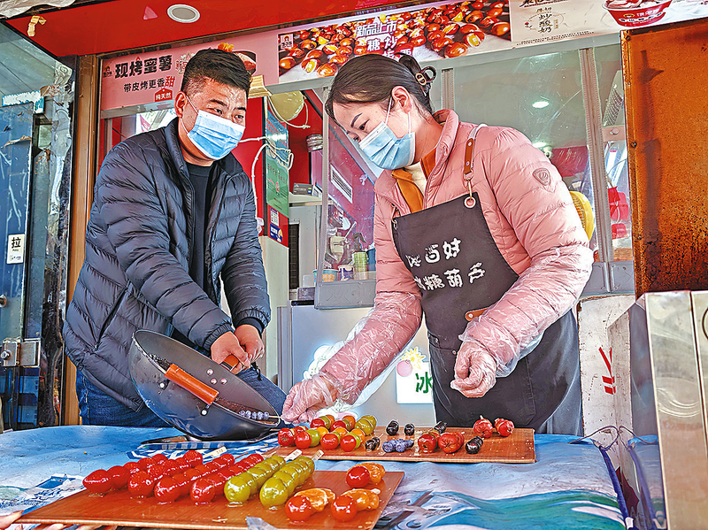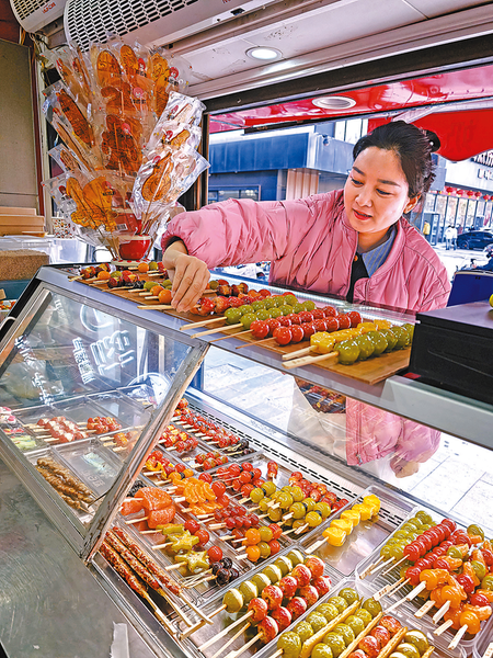谈及与糖葫芦相伴的岁月,张魁伟打开话匣子:2005年,他跟着姐姐赴北京闯荡,在超市里售卖传统糖葫芦,从选果、清洗到熬糖、裹衣,一步步摸索出制作的核心门道。2021年,回到家乡驻马店,选择在繁华的步行街落脚。加盟品牌店后,传统糖葫芦也告别了单一模样,在他们手中变得花样迭出、创意十足。