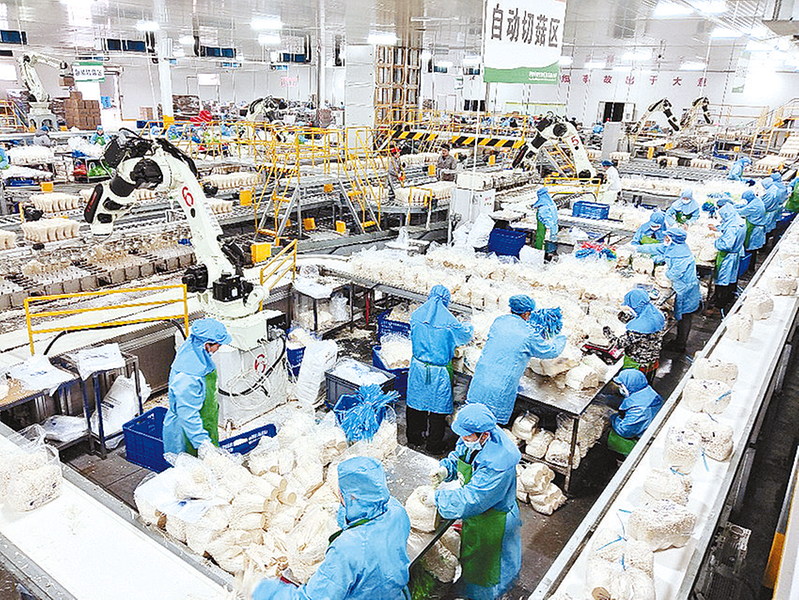 2月9日,确山县河南华绿生物科技有限公司生产车间,工人们在流水线上有条不紊地对金针菇进行分拣、打包。