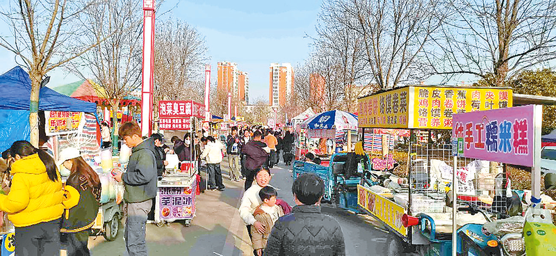 当日下午,记者走进蔡明园广场,首先映入眼帘的是位于中央的年货大集。摊位一字排开,红彤彤的装饰格外喜庆,塔桥猪蹄、状元甄选、上蔡铁锅等特色产品目不暇接。