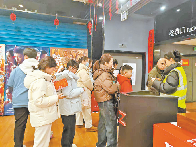 当天上午,记者在市区一家影院看到,检票口前已经排起了长队,市民在工作人员的引导下有序检票入场(如图)。