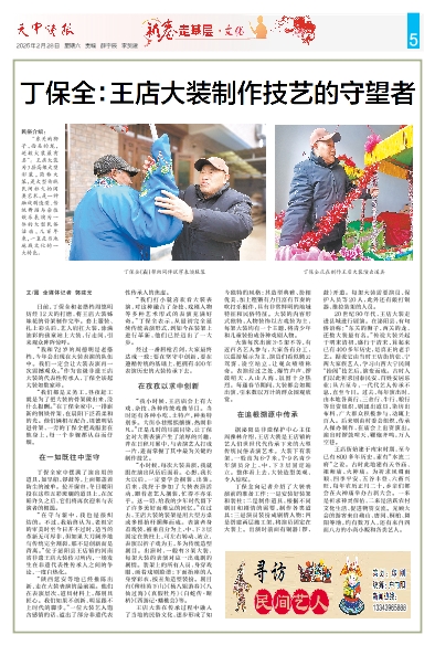 “我小时候,王店庙会上有大戏、杂技、各种传统戏曲节目。当时还有各种小吃、土特产,种类特别多。大街小巷熙熙攘攘,热闹非凡。”正是儿时的耳濡目染,让丁保全对大装表演产生了浓厚的兴趣,并在日积月累中,与表演艺人打成一片,进而掌握了其中最为关键的制作技艺。