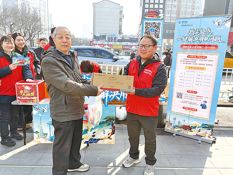 本报讯(文/图 全媒体记者 田久 通讯员 张燕)3月10日上午,国网驻马店供电公司在市区爱家购物中心门前广场开展“指尖轻点 一键解决用电问题”宣传活动,将便捷用电服务送到市民身边(如图)。