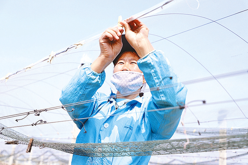 现场,大家两人一组,相互配合,将薄膜从葡萄架顶端缓缓铺设,用压膜绳和卡具牢牢固定。