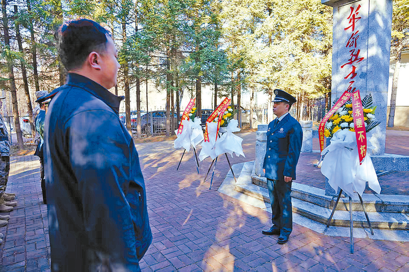 在舒兰市烈士陵园,舒兰市人武部官兵重温周昆训烈士事迹。 (舒兰市人武部供图) 本报讯(全媒体记者 张锟 通讯员 李红军)清明寄哀思,英烈永流芳。在缅怀先烈、追思英魂的清明时节,为深切致敬抗洪烈士周昆训,传承弘扬英雄精神,4月1日,英雄故里驻马店市确山县人武部、英雄牺牲地吉林省舒兰市人武部跨越千里山河,同步开展庄重肃穆的缅怀祭扫活动,以军人的崇高礼仪缅怀烈士功绩,凝聚起崇尚英雄、学习英雄、关爱英雄的磅礴时代力量。