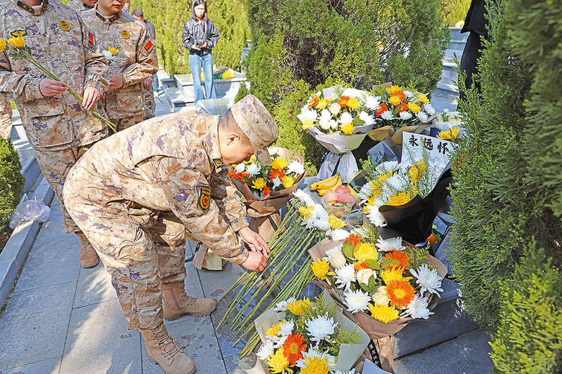 在确山县竹沟革命烈士陵园,确山县人武部官兵向周昆训烈士献花。 张程皓/摄