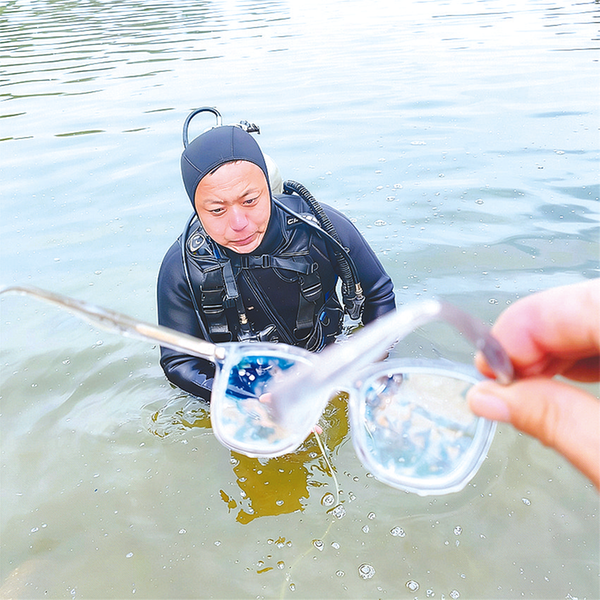冰冷的河水、复杂的水况没有阻挡住贾孟杰的脚步。他凭借海军退役军人的硬朗体质和丰富的水上救援经验,在浑浊的河水中仔细搜寻、精准定位。经过一番紧张不懈的努力,那副遗失的眼镜终于被成功打捞上岸(如图)。