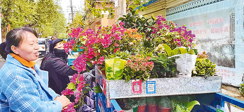 4月9日上午,在市区向阳街,一名中年女子站在一辆电动三轮车旁,等待顾客挑选鲜花。女子叫李春梅,她的三轮车上,三角梅、长寿花、绿萝等花卉绿植错落摆放,色彩斑斓的花朵在春风中摇曳,引得不少市民驻足挑选。“春天到了,大家都想给家里添点绿意,三角梅花色艳、好养活,最近卖得可火了!”李春梅一边整理着花枝,一边笑着介绍。