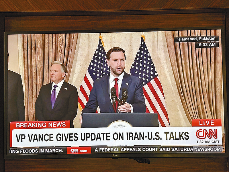 这是4月12日在巴基斯坦首都伊斯兰堡拍摄的美国代表团召开新闻发布会的电视画面。 新华社发(王申/摄) 新华社伊斯兰堡4月12日电 美国和伊朗在巴基斯坦首都伊斯兰堡的谈判12日结束,双方未达成任何协议。伊朗方面说,谈判处于“不信任和猜疑的气氛中”,双方在两三个重要问题上存在分歧。美国方面称,美方已非常明确地说明自身“红线”,但伊方不接受美方条件。